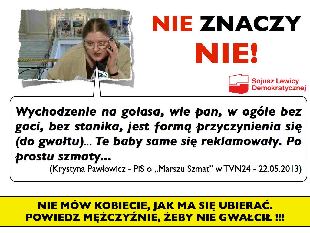 Krystyna Pawłowicz w TVN24 o Marszu Szmat: Te baby same się reklamowały. Po prostu szmaty. Takie coś razi poczucie estetyki. Ulica jest miejscem publicznym i nie należy do dziwek, kurew i alfonsów. Te baby same się reklamowały. Po prostu szmaty. [Posłanka Grodzka] jeżeli stanęła z nimi w szeregu to też jest szmata.