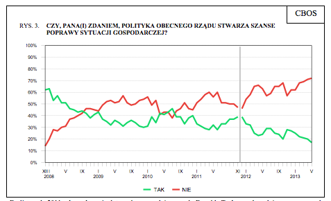 Komentarz analityków CBOS: Majowy sondaż potwierdza tezę, że nad premierem i jego gabinetem zbierają się chmury. Na kryzys poparcia społecznego wskazują najniższe notowania w całym, blisko sześcioletnim okresie rządów koalicji PO-PSL. Choć majowy spadek notowań premiera i rządu nie jest spektakularny, to jednak jest on elementem stałej, utrzymującej się mniej więcej od listopada tendencji obniżania się ocen. Jej zahamowanie może być trudne, bowiem rosnącemu społecznemu niezadowoleniu towarzyszy nasilająca się ostatnio w mediach fala krytyki poczynań rządu i jego przedstawicieli. Chodzi zarówno o liczniejsze sprawy drobne (jak np. dofinansowanie koncertu piosenkarki Madonny), jak i poważniejsze (większe niż spodziewane spowolnienie gospodarcze i rosnące w związku z tym zagrożenia dla budżetu), które w sumie przyczyniają się do tego, że premier, jego gabinet, a także rządząca partia, nie mają ostatnio dobrej prasy.
