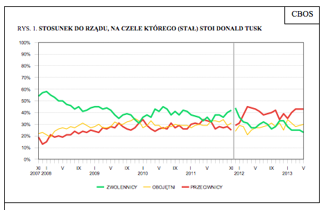 W stosunku do kwietnia nadal malała akceptacja premiera. Zadowolenie z faktu, że Donald Tusk stoi na czele rządu wyraża obecnie nieco ponad jedna czwarta badanych (26%, spadek o 2 punkty), trzy piąte zaś (60%, wzrost o 1 punkt) deklaruje niezadowolonie z szefa rządu. To nadal o 3 punkty więcej respondentów, niż w realizowanym w tym samym czasie badaniu CBOS otrzymała Platforma (23%). Ale też aż o 23 punkty mniej we wskaźniku zadowolenia z premiera od tego, gdy Donald Tusk był w szczycie popularności, zaraz na początku drugiej kadencji swoich rządów.