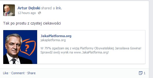Swoją zgodność z Gowinem sprawdził także poseł RP Artur Dębski. Jego wynik - 79% - jest dużo wyższy niż Sepioła, Pomaskiej i Kluzik-Rostkowskiej.