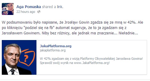 Posłanka Agnieszka Pomaska zwróciła uwagę na drobny zabieg semantyczny w sposobie,w jaki można dzielić się wynikami ankiety na FB. Jej wynik to 42%