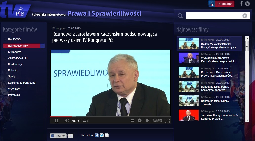 Ten ostatni projekt jest szczególnie interesujący, bo zbiera w jednym miejscu wszystkie klipy wideo opublikowane w sieci przez PiS - spoty kampanijne, wywiady, komentarze polityczne. To swego rodzaju rozbudowa oficjalnego profilu partii na youtube, i próba zwiększenia popularności klipów publikowanych przez PiS. Rozmowa z prezesem opublikowana wczoraj wieczorem na oficjalnym kanale partii na youtube ma dziś rano zaledwie 296 wyświetlenia. W trakcie kongresu nie tylko trwała transmisja na żywo, ale na bieżąco także ukazywały się rozmowy z ekspertami i politykami partii.