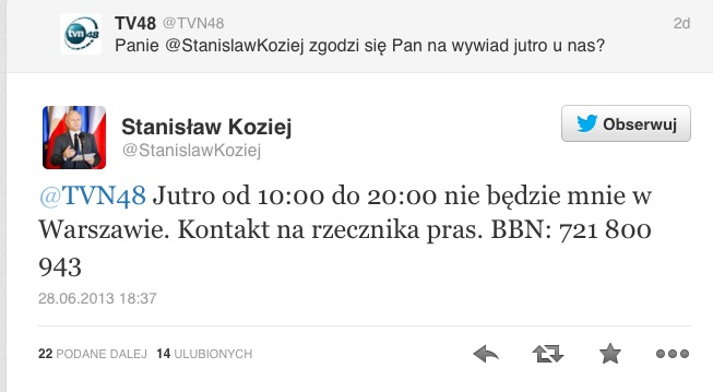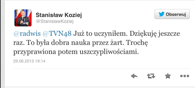 Do boju gotowi? Stanisław Koziej zaciągnął się do twittera. Szef BBN szybko na własnej skórze przekonał się na czym polega fala. Bo na twitterze hierarchie wojskowe nie obowiązują i nawet generał może być tu potraktowany, jak zwykły kot. Podczas pierwszych zajęć na timelinowym poligonie Koziej przyjął zaproszenie od nieistniejącej telewizji. Mała prowokacja obnażyła brak internetowego doświadczenia i zrobiła z Kozieja bohatera jednego dnia. Kilka osób było oburzonych, ale ten hejt trudno nazwać prymitywnym. Generał zapomniał o tym, że cywile miewają często problemy z subordynacją. Teraz powinien już wiedzieć, że twitter to prawdziwe pole minowe. Do tego, gdy już się zacznie pisać dezercja nie wchodzi w grę.