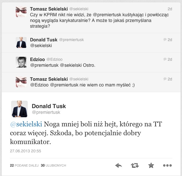 Oczywiście premier Tusk nie jest tu żadnym wyjątkiem a hejtowanie ludzi z pierwszych stron gazet nie ma nic wspólnego z polską specyfiką. Każdy polityk na świecie wchodzący w świat serwisów społecznościowych musi być gotowy na odparcie ataku. Często najlepszą obroną nie jest wcale atak, ale milczenie. Każda odpowiedź jest dla hejterów paliwem. No chyba, że ktoś potrafi w sposób sposób dowcipny odciąć się od swoich przeciwników. Premier, który nie tylko zauważył na twitterze ataki na siebie, ale i dał odczuć, że go dotykają pokazał słabość. Pod postami Józefa Oleksego na Facebooku bardzo często ludzie wklejają piosenkę Kazika "Łysy jedzie do Moskwy". Byłe premier nie reaguje. Nie wchodzi w polemiki ani nie daje znać, że to go dotknęło. Jeśli kiedyś to zrobi może być pewien, że zjawisko się nasili.