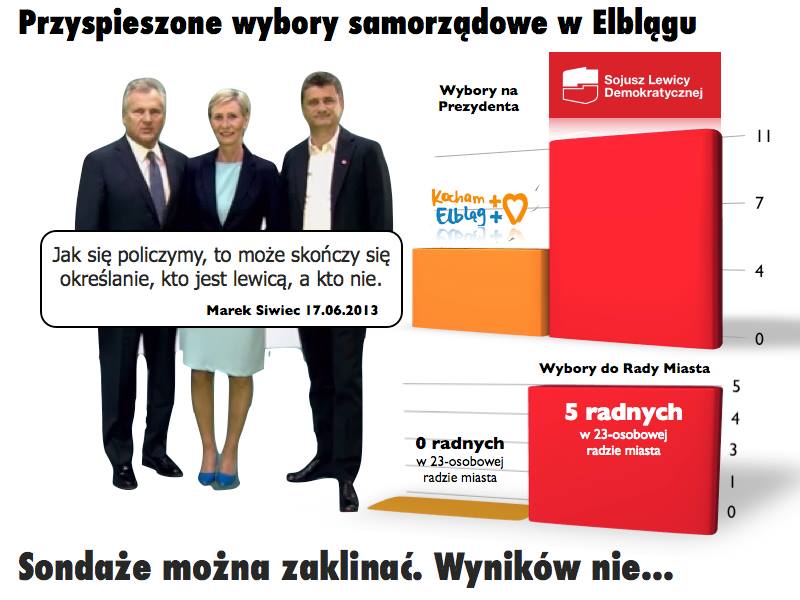 Pewien psychologiczny przełom mogłaby przynieść wygrana kandydatki PO w Elblągu. W zasadzie dziś PO jest w sytuacji, w której wybory w Elblągu musi wygrać. Po wizytach czołówki PO (Buzek, Sikorski, Nowak) i dwukrotnej wizycie premiera (zapowiedział otwarte spotkanie z mieszkańcami w tym, ostatnim tygodniu kampanii) trudno byłoby zlekceważyć taką przegraną i dalej powtarzać, że nad poparciem dla PiS wisi "szklany sufit".