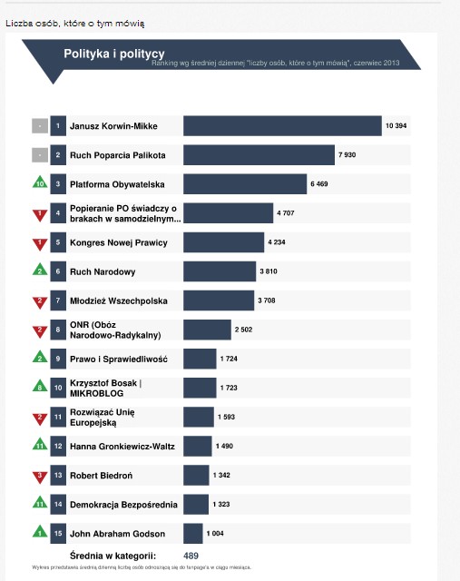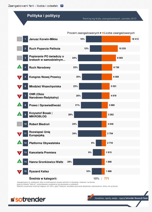 Drugie istotne zjawisko to coraz większa popularność Ruchu Narodowego. Widać to zarówno w liczbach bezwzględnych (wzrost o 26% i ponad 6 tysięcy fanów) jak i w rankingu interaktywności.