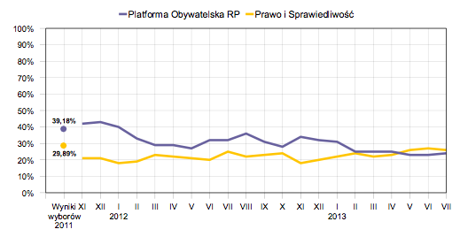 W lipcu układ preferencji partyjnych nie zmienił się. Trzeci miesiąc z kolei największym poparciem społecznym cieszy się PiS. Chęć oddania głosu na partię Jarosława Kaczyńskiego deklaruje 26% potencjalnych wyborców. Tylko niewiele mniej osób (24%) zamierza głosować na PO. Oznacza to, że dystans pomiędzy obiema głównymi partami zmniejszył się w ciągu ostatniego miesiąca o 2 punkty procentowe. Trzecie pod względem liczby zwolenników pozostaje SLD, na które chciałoby głosować 7% zdeklarowanych wyborców. Notowania partii Leszka Millera są jednak gorsze niż miesiąc temu i należą do najniższych, biorąc pod uwagę ostatnie półtora roku.