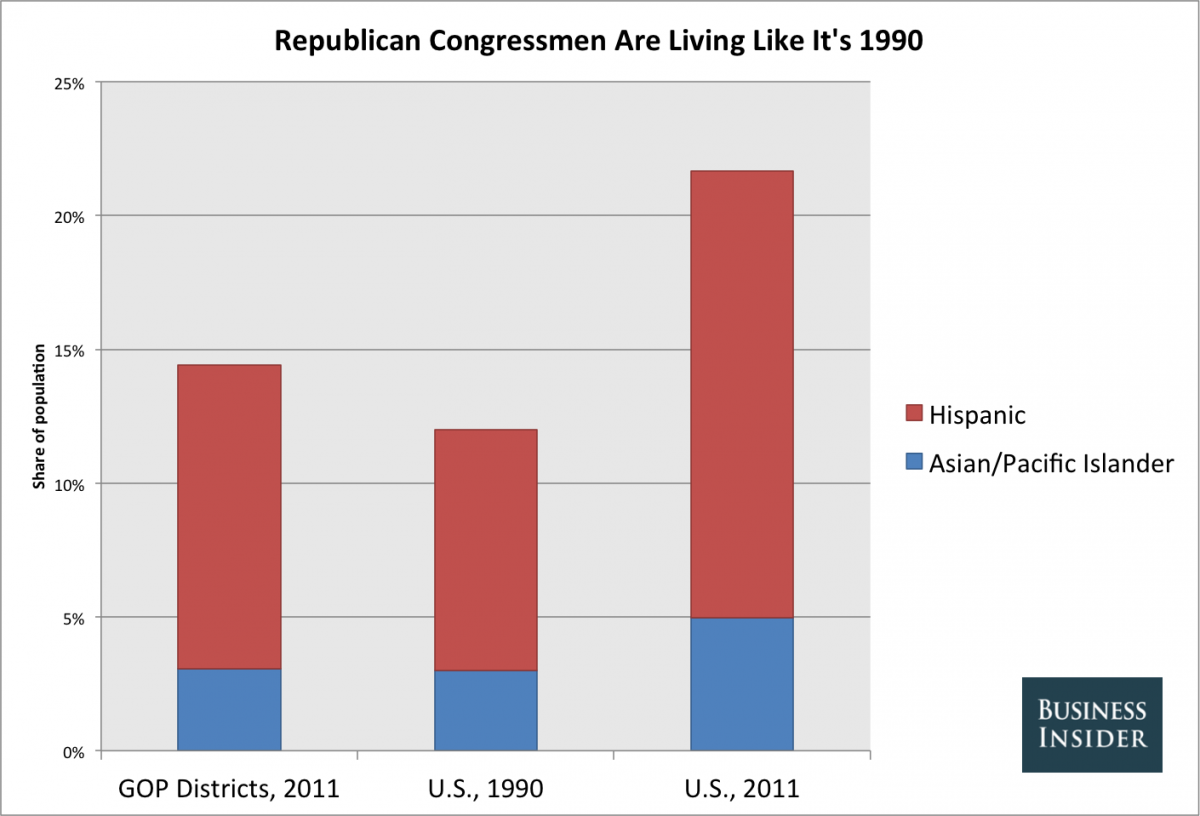 Po tym jak Senat przyjął ustawę (68 głosów za, w tym 14 Republikanów) to samo musi zrobić Izba Reprezentantów. I tu pojawił się oczywisty problem: to Republikanie kontrolują Izbę. A wielu konserwatywnych kongresmenów (wybieranych w okręgach wyborczych, gdzie Latynosi/Azjaci się nie liczą) nie chce słyszeć o legalizacji nielegalnych imigrantów. Republikanie w Izbie są wybierani w okręgach, w których biali to 85%, Demokraci - 65%. Dlatego też dla nich ryzyko dalszej alienacji Latynosów poprzez odrzucenie ustawy jest mało istotne. Latynosi/Azjaci to tylko 14% populacji okręgów, z których wybierani są politycy GOP. Średnia USA - 22%. Pod tym względem, jak to zauważa Business Insider, GOP - z pewnymi wyjątkami np. okręgi na Florydzie - tkwi w latach 90-tych.