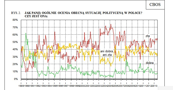 W sferze polityki sytuacja jest stabilna: "Od kilku miesięcy w zasadzie nie zmieniają się oceny sytuacji politycznej w kraju. Nadal nieco ponad połowa badanych (53%) określa ją jako złą, jedna trzecia (35%) jako przeciętną, a tylko co czternasty respondent (7%) wyraża zadowolenie z jakości życia politycznego w kraju."
