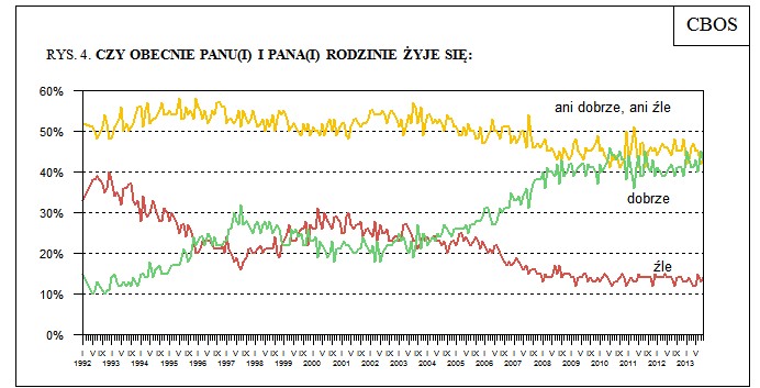 CBOS odnotowuje jednak pogorszenie oczekiwań co do kondycji gospodarstw domowych: "Nieco mniej optymistyczne niż przed miesiącem są przewidywania dotyczące kondycji materialnej gospodarstw domowych respondentów. Obecnie odsetek tych, którzy prognozują jej pogorszenie w najbliższym roku (18%, wzrost o 2 punkty), przeważa nad odsetkiem osób liczących na poprawę (14%, spadek o 3 punkty). Tradycyjnie jednak zdecydowana większość badanych (68%) nie oczekuje żadnych znaczących zmian w tej dziedzinie".