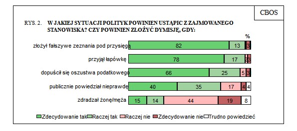 CBOS zapytał również, co powinno być przyczyną ustąpienia polityka ze stanowiska. Jak się okazuje: Polacy zdecydowanie negatywnie oceniają krzywoprzysięstwo (82% kategorycznie opowiada się za dymisją polityka, który złożył fałszywe zeznanie, a 13% skłania się ku temu poglądowi) oraz przyjęcie łapówki (78% zdecydowanie, 17% raczej tak). Nieco mniej jednoznaczne są opinie na temat polityka, który dopuścił się oszustwa podatkowego. Około dwóch trzecich badanych (66%) stanowczo domaga się jego dymisji, a co czwarty (25%) skłania się ku takiej opinii. Publiczne stwierdzenie nieprawdy jako powód do rezygnacji oceniane jest w sposób kategoryczny przez 40% badanych i mniej zdecydowanie przez 35%. Zdrada małżeńska dla większości badanych (63%) nie jest dyskwalifikująca, natomiast co czwarty (29%) uważa, że polityk obciążony takimi zarzutami powinien zrezygnować z pełnionej funkcji.