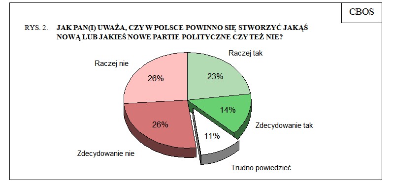 Młodzi chcą nowej partii. Jak podaje CBOS: " Choć zdecydowana większość Polaków ma poczucie braku odpowiedniej reprezentacji politycznej, tylko nieco ponad jedna trzecia badanych (37%) opowiada się za poszerzeniem istniejącej oferty partyjnej o nowe ugrupowania, większość zaś jest temu przeciwna (52%). Nowych inicjatyw politycznych bardziej niż inni zdają się oczekiwać przede wszystkim ludzie młodzi, w wieku między 18 a 34 rokiem życia (45%), legitymujący się wyższym wykształceniem (50%), mieszkańcy dużych miast (48%) i największych aglomeracji (46%), a więc ci, którzy stosunkowo najczęściej odczuwali deficyt ugrupowań zasługujących na ich głos. Spośród grup społeczno-zawodowych za powstaniem nowych partii stosunkowo najczęściej opowiadają się pracownicy średniego szczebla i technicy (56%) oraz uczniowie i studenci (50%). (...) Wśród elektoratów partyjnych, z których – jak widzieliśmy – większość jest raczej mało usatysfakcjonowana istniejącą ofertą polityczną, relatywnie najczęściej powołaniem jakiegoś nowego ugrupowania byliby zainteresowani wyborcy SLD (48%), choć nawet wśród nich niemal taki sam odsetek stanowią osoby przeciwne tworzeniu nowej partii (49%). Również wyborcy najmniejszych ugrupowań, których liczebność w próbie nie pozwala na indywidualne analizy (w tym zwolennicy Ruchu Palikota), częściej niż inni chcieliby powołania nowej partii (48%). Najrzadziej za stworzeniem jakiegoś nowego bytu politycznego optują wyborcy PiS (29%)".