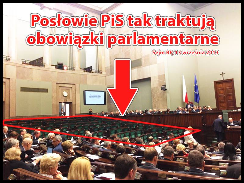 Politycy Platformy oraz parlamentarni sprawozdawcy zalali media społecznościowe zdjęciami pustych sejmowych ław PiS podczas głosowań nowelizacji budżetu. "Nie jesteśmy częścią układu, który ma większość"- mówił Adam Hofman. Dzisiejsze opuszczenie budynku parlamentu to kulminacja dość specyficznej strategii, jaką przyjęła prowadząca w sondażach partia Jarosława Kaczyńskiego. Wywiad dla Rzeczpospolitej, konfrontacyjny wobec biznesu ton wystąpienia byłego premiera Kaczyńskiego w Krynicy i zaprezentowane tam propozycje podatkowe, spin wokół taśm Wprost z Podkarpacia ("Szafa Lesiaka")... PiS, we wrześniu 2013, działa zupełnie inaczej niż rok temu, kiedy chciał uchodzić za "alternatywę" i partię gotową do przejęcia władzy od dnia pierwszego. Dziś pozycjonuje się jak partia protestu i zrywa ze strategią- "pokażmy się jako partia, która może rządzić".