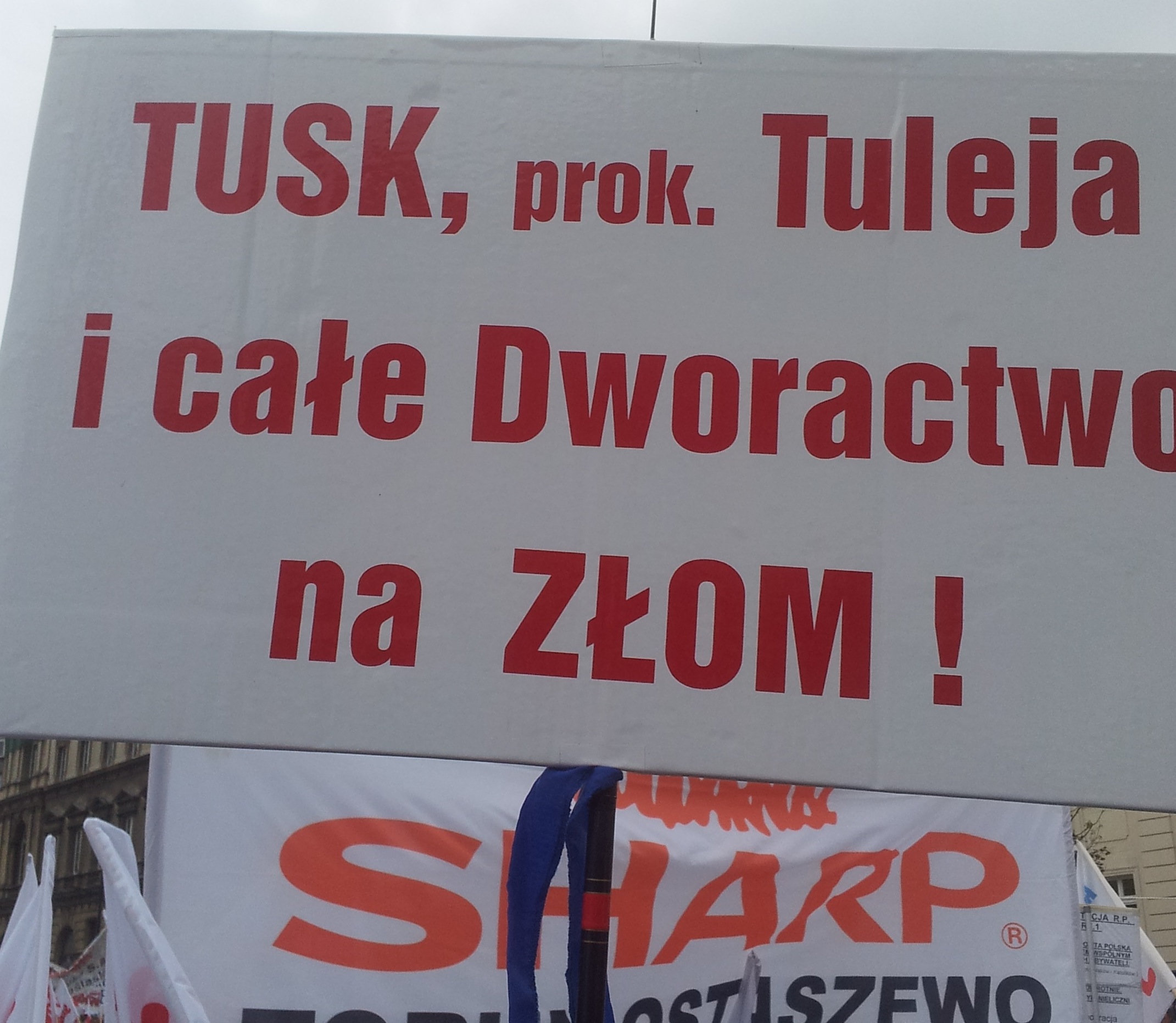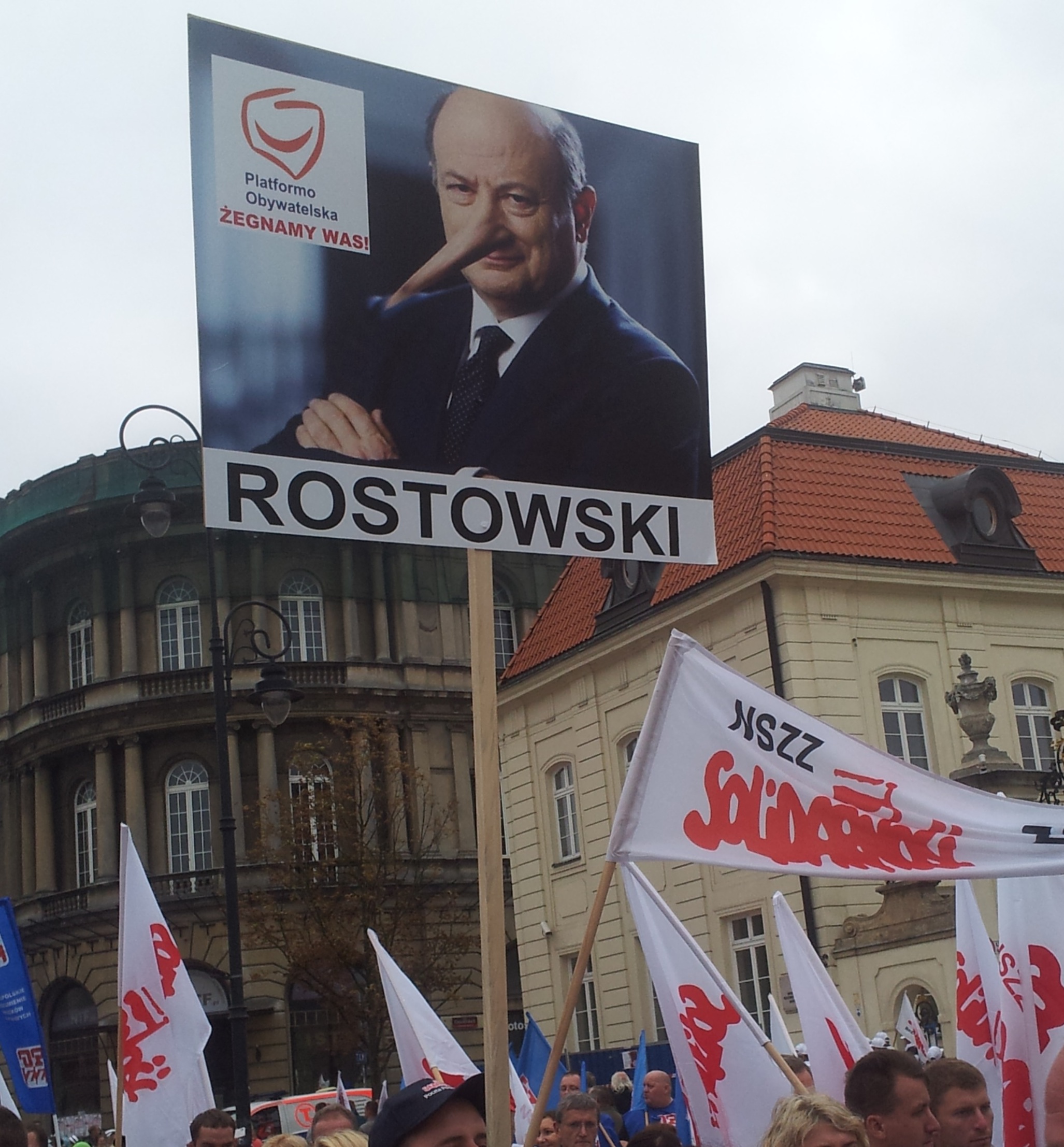 Ten protest był nie tylko największy od lat, ale i najbardziej kolorowy. Było spokojnie. Może to dlatego, że związkowcy bardziej niż na paleniu opon byli skoncentrowani na tworzeniu chwytliwych haseł i ciekawych transparentów. Dominowały oczywiście żarty z Platformy Obywatelskiej.Choć ten obrazem może wydawać się nawet sympatyczny, to związkowcy niosąc go krzyczeli: 'Była zbrodnia, będzie kara." To były chyba najostrzejsze hasła, bo w większości przypadków skandowano branżowo, to znaczy pielęgniarki krzyczały: "nie chcemy żyć w chorym kraju" a maszyniści: " rząd do upadłości a nie spółki kolejowe". We wszystkim łatwo się jednak pogubić, tak jak ci uczestnicy dla których sędzia Tuleja, to prokurator.Ponieważ związkowcy na swojej trasie mieli też Pałac Prezydencki nie mogło zabraknąć obrońców krzyża, którzy przekonywali, że Bóg nie popiera obecnej władzy.