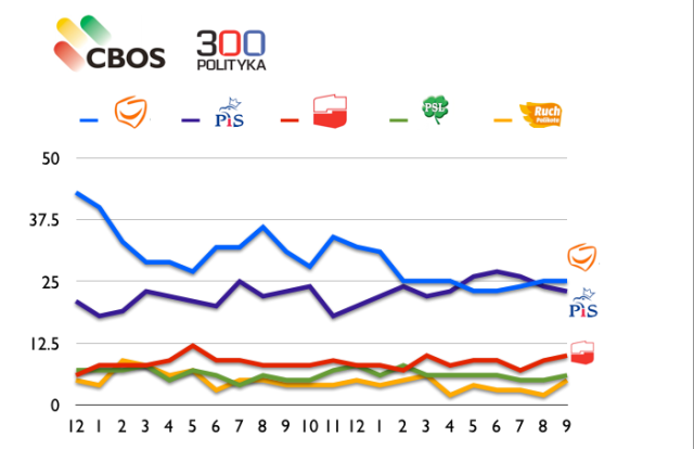 I rzeczywiście, co najmniej jeden ostatni sondaż - z tych dostępnych publicznie - daje Palikotowi powody do takiego optymizmu. W wrześniowym rankingu popularności CBOS jest on politykiem, który odnotował największy wzrost zaufania - choć w badaniu, w którym zyskiwali wszyscy kluczowi gracze, włącznie z Kaczyńskim i Tuskiem. Palikot zyskał aż 9 pp, i ma teraz 27%. W ten sposób plasuje się tuż za Jarosławem Gowinem (32%) a wyprzedza Janusza Piechocińskiego (25%). To najlepszy wynik Palikota w tym roku (w styczniu miał 26%) i najlepszy od sierpnia 2012 roku. Warto w tym momencie przypomnieć, co Palikot pisał o CBOSie, gdy w czerwcowym, cyklicznym sondażu poparcia jego partia miała tylko 3%. "Tylko w CBOS mamy spadek i to tak duży! Czym to wytłumaczyć? Może tym, że CBOS zawsze pudłuje i jego prognozy się nie sprawdzają, a już w stosunku do Ruchu Palikota, te pomyłki mają skandaliczny wręcz zasięg! Ale dlaczego tak jest? Może dlatego, że szefowa CBOS - Mirosława Grabowska, jest członkiem Rady chrześcijańskiego think tanku: "Laboratorium Więzi"?"
