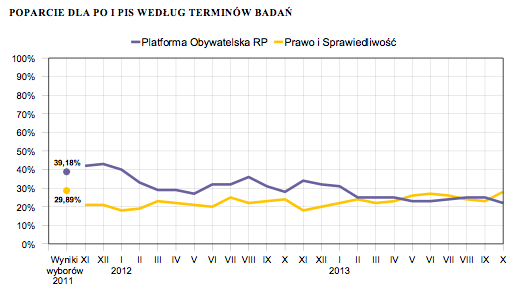 W październiku poniżej wyborczego progu znalazł się Ruch Palikota (4%), który w porównaniu z wrześniem nieznacznie stracił, a także Prawica Janusza Korwin Mikkego (4%, wzrost o 2 punkty). Swoich zwolenników znalazły jeszcze Solidarna Polska Zbigniewa Ziobry (2%) i PPP (1%).