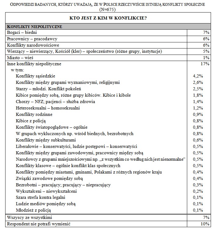 Wśród konfliktów niepolitycznych dominuje "starcie biednych z bogatymi" (7%) a także "pracownicy-pracodawcy" - 6%
