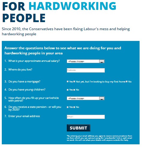 Osią całej kampanii jest hasło "Britain is turning a corner". Pojawia się na wiele sposobów w przekazie partii Np. w taki sposób doradcy Camerona za pomocą jego oficjalnego konta na TT zachęcają do aktywnego włączenia się w działalność torysów.