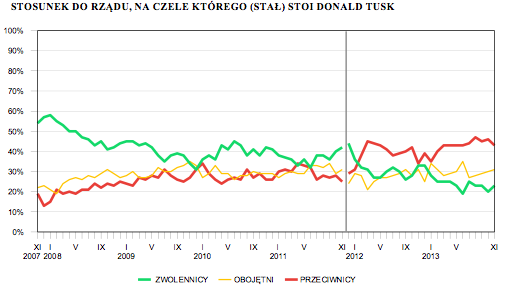 Komentarz analityków CBOS do ich badania: Po dwóch latach działalności – w przededniu zapowiadanej od pewnego czasu rekonstrukcji – drugi rząd Donalda Tuska oceniany jest zdecydowanie krytycznie. Wprawdzie w listopadzie nieznacznie zwiększył się poziom identyfikacji z urzędującym gabinetem, minimalnie lepiej oceniane są efekty jego działalności, a także nieco wzrosła liczba osób zadowolonych z premiera, jednak ogólna wymowa notowań rządu jest negatywna. Większość Polaków deklaruje niezadowolenie z efektów jego pracy, prowadzonej przezeń polityki gospodarczej, jak i z tego, że na czele rządu stoi Donald Tusk. Ponadto stosunkowo niewielu badanych identyfikuje się z urzędującym gabinetem, a liczba jego zwolenników jest mniej więcej o połowę mniejsza od liczby przeciwników. Należy zaznaczyć, że obecne notowania rządu są gorsze zarówno od tych, jakie uzyskiwał on przed dwoma laty – na początku swojego funkcjonowania, jak i od osiąganych przez pierwszy rząd Donalda Tuska na półmetku jego działalności. Warto jednak podkreślić, że drugi rząd koalicji PO–PSL rozpoczynał swoją działalność z poparciem społecznym znacznie niższym niż poprzedni gabinet. Czas pokaże, czy rekonstrukcja rządu wpłynie na jego społeczny wizerunek i odwróci negatywny trend w notowaniach gabinetu Donalda Tuska.