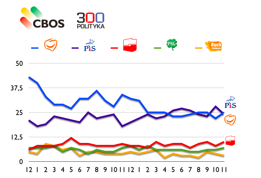 Najnowszy sondaż MB dla "Faktów" pokazał powrót ludowców na granicę progu wyborczego. Ostatnie kilka miesięcy to pasmo mniejszych lub większych sondażowych rozczarowań dla tej partii. Ostatnie badanie MB pokazujące PSL nad progiem zostało opublikowane 10 września. W CBOS sytuacja ludowców jest nieco lepsza : 7% w listopadzie.