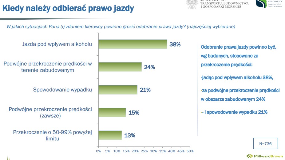 W sierpniowym badaniu przeprowadzonym przez Millward Brown na zlecenie Krajowej Rady Bezpieczeństwa Ruchu Drogowego (KRBRD) 38% popiera odbieranie prawa za kierowanie samochodem pod wpływem alkoholu, 24% za podwójne przekroczenie prędkości w terenie zabudowanym. 62 proc. badanych akceptuje szybką jazdę jeżeli kierowca potrafi dostosować się do warunków.
