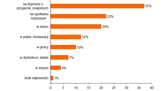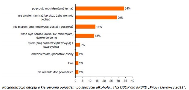 Tymczasem w badaniu TNS OBOP przeprowadzonym na początku 2011 roku na zlecenie KRBRD wynika, że 37% nietrzeźwych kierowców wsiadło do samochodu po imprezie lub spotkaniu u znajomych, 22% po spotkaniu rodzinnym, 20% po pobycie w domu.