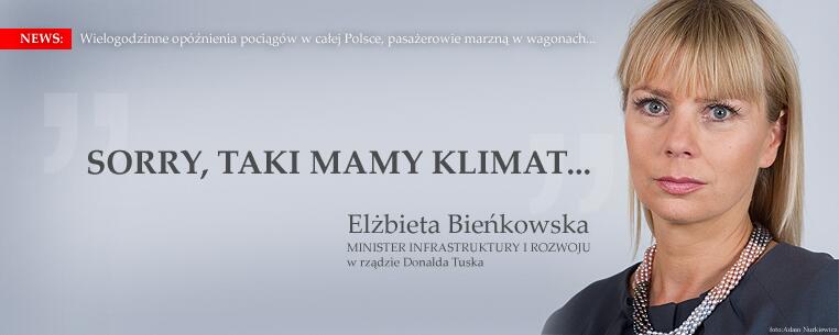 -- BIEŃKOWSKA MA RACJĘ - WYNIKI SONDY GAZETY.PL. "61 proc. (dokładnie 13835 osób) uznało, że Bieńkowska w kwestii opóźnień pociągów i skali problemu (2 składy uziemione na 4 tysiące) "ma rację, taki mamy klimat" i dobrze, "że ma odwagę powiedzieć prawdę". http://wiadomosci.gazeta.pl/wiadomosci/1,114871,15313692,Bienkowska_ma_racje__Dobrze__ze_ma_odwage_mowic_prawde_.html