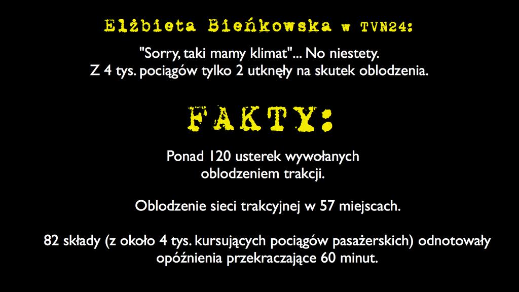 -- POLITYCZNE HASŁO DNIA: SORRY TAKI KLIMAT. Zestawienie słów Bieńkowskiej z warunkami podróży pasażerów dwóch najbardziej opóźnionych pociągów. "Dziś zmieniła ton, ale nie przeprosiła. Tusk nie bronił Bieńkowskiej, nawet się nie starał". Setka Bieńkowskiej o gładkich słowach, "Pan premier tak uważa" - wypowiedź wicepremier o przeprosinach. Setki Millera o lojalności i Hofmana o arogancji. Na koniec materiału Krzysztof Skórzyński mówi o "przyspieszonym kursie polityki", który przechodzi Bieńkowska.