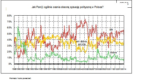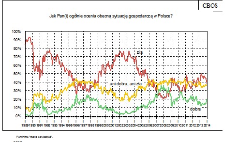 -- CBOS: POLEPSZAJĄ SIĘ NASTROJE SPOŁECZNE W POLSCE. " Jak pisze CBOS, liczba respondentów źle oceniających kierunek zmian w Polsce jest najniższa od listopada 2012 roku. Oceny sytuacji politycznej i gospodarczej także się poprawiają. Polacy coraz mniej obawiają się bezrobocia, i są większymi niż w grudniu optymistami co do przyszłości." https://300polityka.pl/news/2014/01/22/sondaz-nastroje-spoleczne-sa-najlepsze-od-listopada-2012-r-polacy-coraz-mniej-obawiaja-sie-bezrobocia/