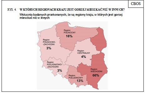 Nie są też zaskakujące wyniki, w których ankietowani wskazują najgorsze regiony w Polsce. Jak zauważa CBOS: "Ponad połowa Polaków (58%) uważa, że w kraju są regiony, które można uznać za gorsze od innych dla mieszkańców. Odnotowaliśmy tu znaczącą różnicę w porównaniu z opiniami sprzed siedemnastu lat. Wówczas ponad dwie trzecie badanych (71%) uważało, że w niektórych regionach żyje się gorzej niż w innych. (...) Podsumowując, dwie trzecie badanych przekonanych, że w niektórych regionach mieszka się gorzej, uważa za takie miejsce Region Wschodni (66%). Blisko co szósty (16%) wskazał na Region Północny, a co ósmy (13%) na Południowy. Pozostałe części kraju były wymieniane bardzo rzadko.