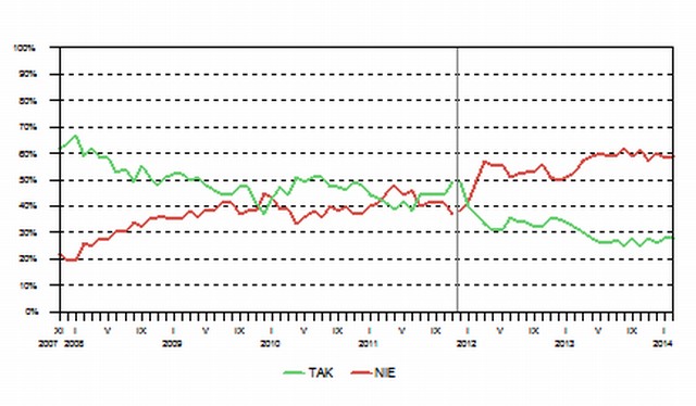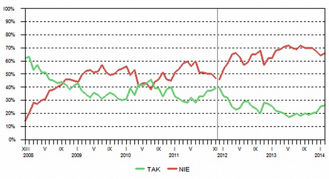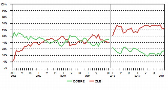Niemal identyczna sytuacja jest z ocenami wyników działania gabinetu Tuska. Zdecydowana większość Polaków (63%, od stycznia wzrost o 1 punkt) krytycznie wypowiada się o wynikach działalności rządu. Pozytywnie efekty jego pracy ocenia obecnie 27% badanych (wzrost o 1 punkt).