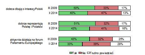 Jak pisze CBOS: "Niemal połowa badanych (47%) uważa, że nie dbają oni wystarczająco dobrze o interesy naszego kraju, natomiast dwie piąte (40%) jest przeciwnego zdania. Ponad dwie piąte badanych (43%) jest zadowolonych z tego, jak eurodeputowani reprezentują w PE Polskę, i niemal tyle samo (41%) ocenia ich pracę negatywnie. Blisko czterech na dziesięciu ankietowanych (39%) kwestionuje opinię, że polscy eurodeputowani są aktywni na forum europejskim, natomiast dobrze pod tym względem postrzega ich działania co trzeci respondent (33%). Pod koniec poprzedniej kadencji Parlamentu Europejskiego nastawienie Polaków do pracy naszych europarlamentarzystów było znacznie bardziej przychylne niż obecnie, a ocena ich działalności na ogół korzystna. Wydaje się, że obserwowane pogorszenie może być związane z rosnącym poziomem krytycyzmu wobec polityki i klasy politycznej w kraju"