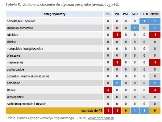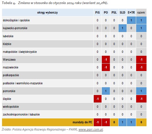 W wariancie zakładającym frekwencję na poziomie 20%, PiS ma 20 mandatów, Platforma 16, SLD 8, EP/TR 4 a PSL 3. Identyczne wyniki partie osiągają przy frekwencji 25%. W stosunku do poprzedniej prognozy (opracowanej na podstawie styczniowych sondaży), PiS i PO tracą po jednym mandacie, zyskują (też po jednym) SLD i EP/TR. PSL bez zmian w obu wariantach.