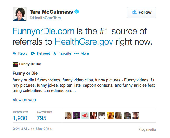 Tara McGuinness, jedna z osób zajmująca się komunikacją w Białym Domu, której zadaniem jest promocja Obamacare, na swoim oficjalnym twitterowym koncie napisała, że strona FunnyorDie.com wygenerowała sporo ruchu: