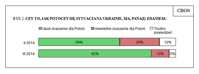 -- SONDAŻ: POLACY BARDZO UWAŻNIE ŚLEDZĄ WYDARZENIA NA UKRAINIE, 72% OBAWIA SIĘ O BEZPIECZEŃSTWO POLSKI: Zdecydowana większość badanych (82%) twierdzi, że rozwój wypadków na Ukrainie ma duże znaczenie dla Polski. Tylko co siódmy (13%) jest przeciwnego zdania. Ponadto o połowę zmniejszył się odsetek badanych, którzy nie potrafią ocenić znaczenia wydarzeń ukraińskich dla interesów Polski (z 12% do 5%).
