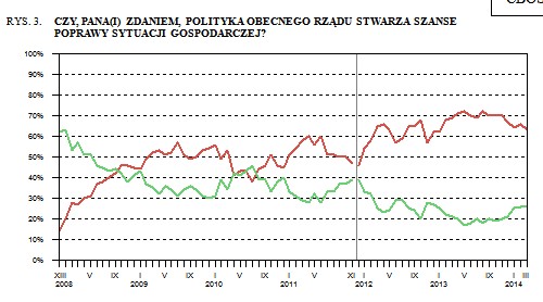 Polepsza się też ocena polityki gospodarczej. Obecnie 63% (spadek o 3 punkty procentowe) ankietowanych uważa, że polityka obecnego rządu nie stwarza szans na poprawę sytuacji gospodarczej, natomiast przeciwnego zdania jest co czwarty badany (26%, bez zmian).