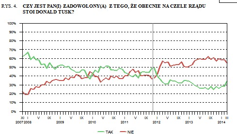 Zadowolenie z tego, że pracami Rady Ministrów kieruje Donald Tusk, wyraża obecnie co trzeci ankietowany (34%, wzrost o 6 punktów procentowych). Nadal jednak ponad połowa Polaków (55%, spadek o 4 punkty) jest z tego niezadowolona. Widać identyczny trend jak w pozostałych kategoriach: "Niezadowoleni z premiera są przede wszystkim sympatycy Prawa i Sprawiedliwości (88%), jednak w porównaniu z lutym grupa przeciwników Donalda Tuska wśród potencjalnych wyborców PiS nieco zmalała, zwiększyła się natomiast grupa jego zwolenników (po 4 punkty procentowe)"
