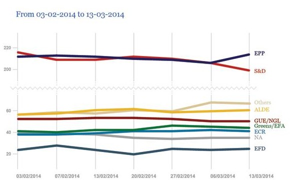 Pozostałe grupy uzyskują następujące wyniki: ALDE 61 mandatów, GUE/NGL 51 miejsc, Zieloni/EFA 45, konserwatyści z ECR 42, EFD 26. Jak wynika z informacji dostarczonych przez TNS, chadecja zaczęła wygrywać z socjalistami na początku marca.