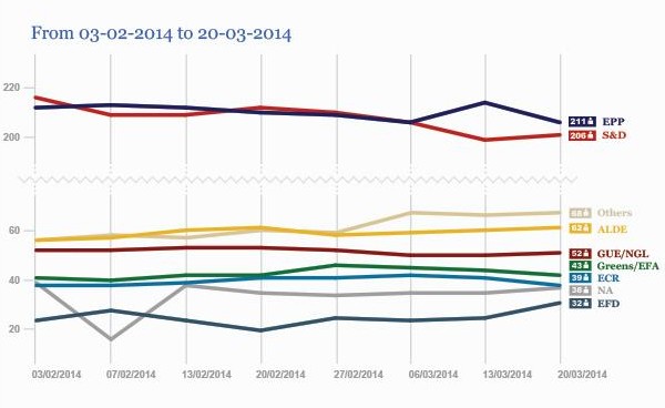 Prognoza została sporządzona na podstawie wyników sondaży ze wszystkich krajów europejskich do 20 marca włącznie. W porównaniu do symulacji obejmującej sondaże do 13 marca, EPP straciła 8 mandatów, a socjaliści zyskali dwa.