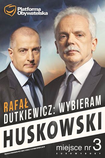 Prezydent Wrocławia Rafał Dutkiewicz jest na oficjalnym plakacie wyborczym i billboardzie Stanisława Huskowskiego, kandydata PO do PE z okręgu dolnośląsko-opolskiego. Huskowski startuje z 3. miejsca. Jak się dowiadujemy, prezydent Wrocławia aktywnie zaangażuje się w jego kampanię, mimo niedawnego wypadku samochodowego.