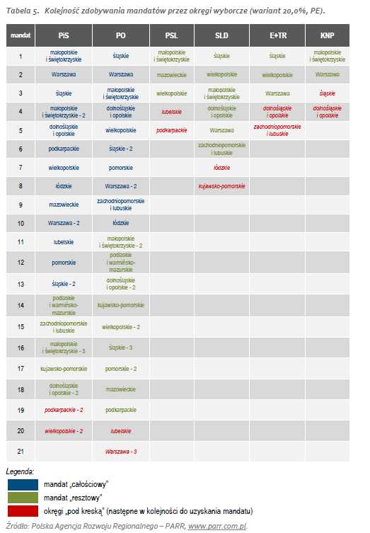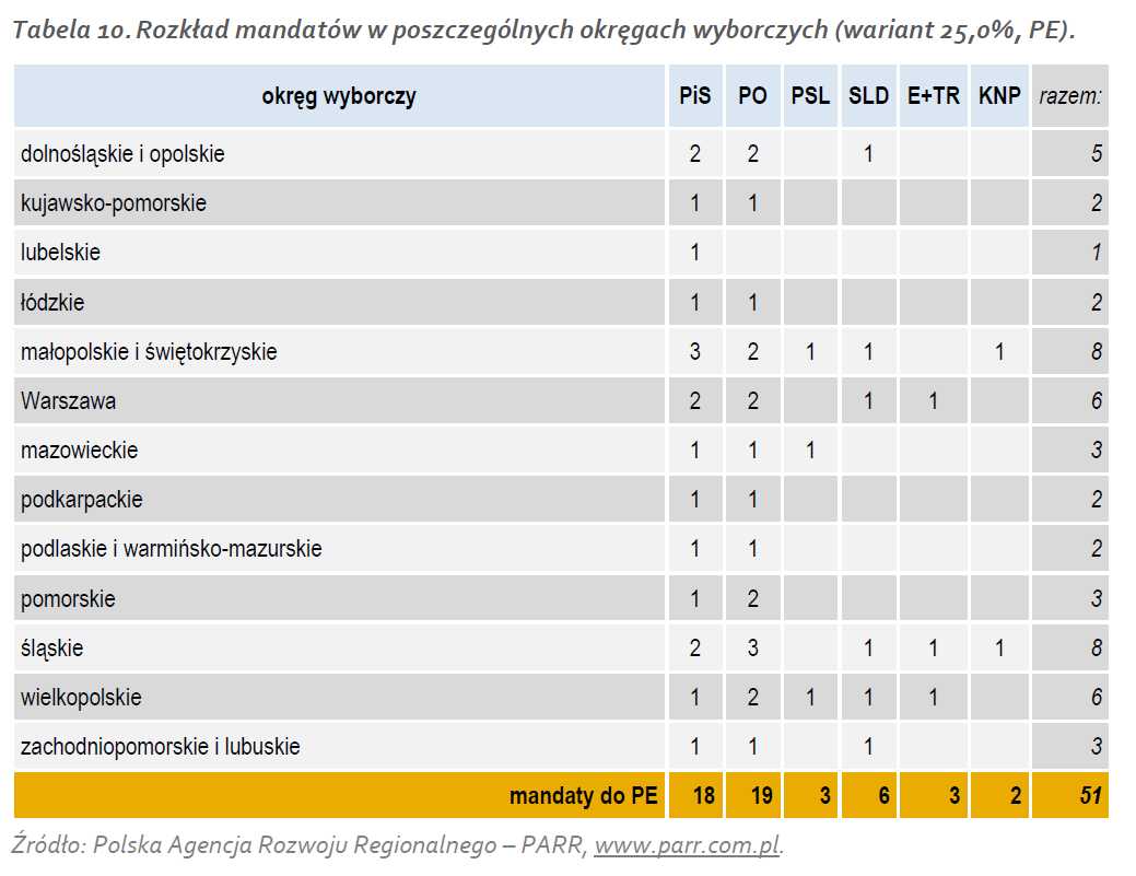 W najnowszej symulacji rozkładu mandatów opracowanej przez PARR na podstawie kwietniowych sondaży Platforma minimalnie wygrywa z PiS. Partia Donalda Tuska ma 19 mandatów, PiS może liczyć na 18. SLD na 6, EP/TR zdobywa 3, podobnie jak PSL. Kongres Nowej Prawicy ma w tej prognozie 2 mandaty (Warszawa i Małopolska), zakładając frekwencję 20%. Prognoza zakłada poparcie dla PO na poziomie 33,3, dla PiS - 32,7, SLD - 11,8, PSL - 6,6 oraz EP/TR 5,2 i KNP 5,18.