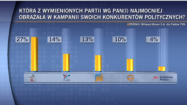 Na zlecenie "Faktów" TVN pracownia Millward Brown przepytała Polaków, która z partii najmocniej obrażała swoich konkurentów. W niechlubnym rankingu zwyciężyło Prawo i Sprawiedliwość - na partię tę wskazało 27 proc. ankietowanych.