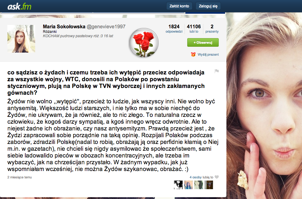 -- WĄTPLIWOŚCI WOKÓŁ INTERNETOWYCH WPISÓW DZIECKA WRZUCONEGO W WIR POLITYKI: “„Rozpijali Polaków podczas zaborów, zdradzili Polskę (nadal to robią, obrażają ją oraz perfidnie kłamią o Niej m.in. w gazetach), nie chcieli się nigdy asymilowac że społeczeństwem, sami siebie ładowali do pieców w obozach koncentracyjnych, ale trzeba im wybaczyć, jak na chrześcijan przystało. W żadnym wypadku, jak już wspomniałam wcześniej, nie można Żydów szykanowac, obrażać.„- to jedno ze stwierdzeń Marysi Sokołowskiej na popularnym wśród nastolatków serwisie Ask.fm.” https://300polityka.pl/news/2014/05/30/pis-ujal-sie-za-marysia-nie-sprawdzajac-ze-w-internecie-glosi-antysemickie-poglady/