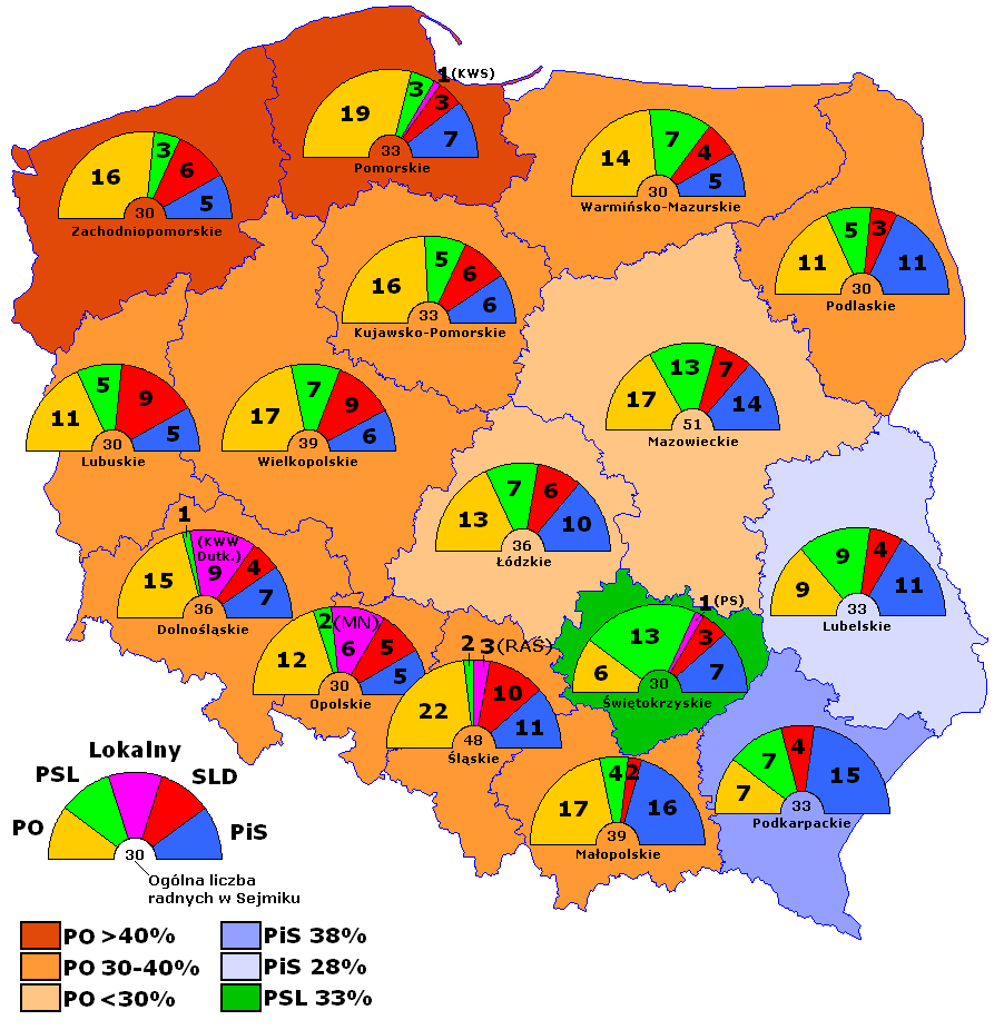 1. Dolny Śląsk kluczowym województwem? Zwycięstwo lub porażka w wyborach samorządowych będzie ogólnokrajowo interpretowana na poziomie sejmików. Tu toczy się najważniejsza gra. W 2010 roku PO zdobyła 30,89% głosów w tych wyborach (łącznie 222 mandaty), PiS 23% (141 mandatów), trzecie było PSL z 16% (93 mandaty).