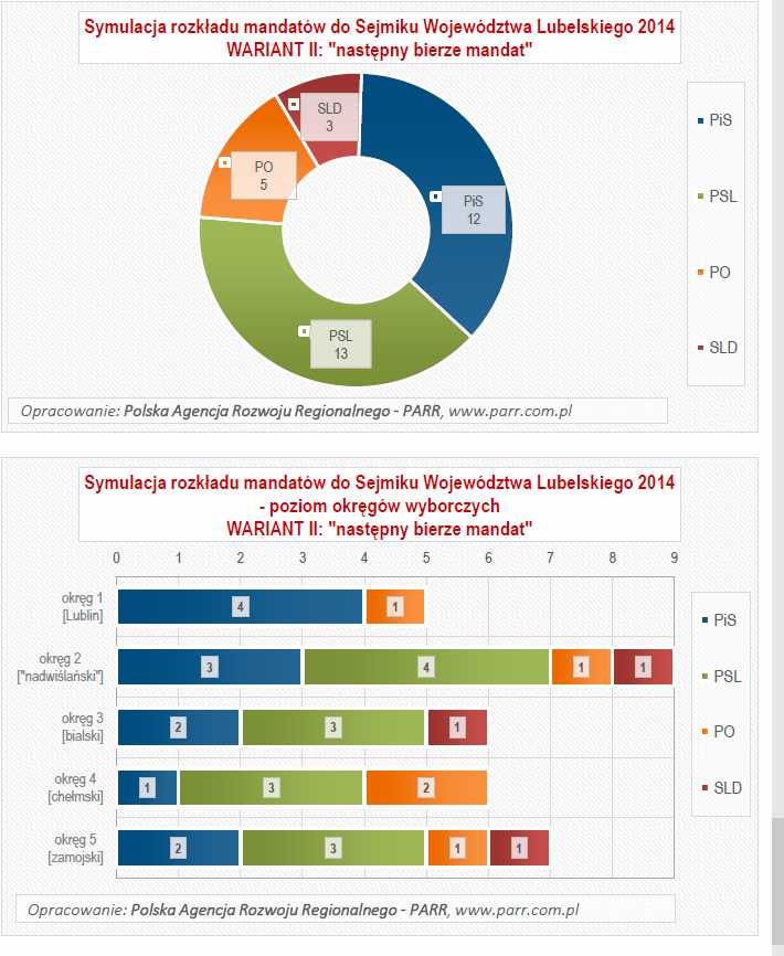Wariant II - "następny bierze mandat". Jak pisze PARR: "Wariant ten zakłada sytuację, że pierwsza partia, która jest „pod kreską” (nie uzyskuje mandatu), wyprzedza ostatnią partię, która zdobywa mandat w danym okręgu wyborczym. Symulacja jednak nie uwzględnia różnicy pomiędzy ostatnią partią biorącą mandat, a pierwszą partią „pod kreską”.