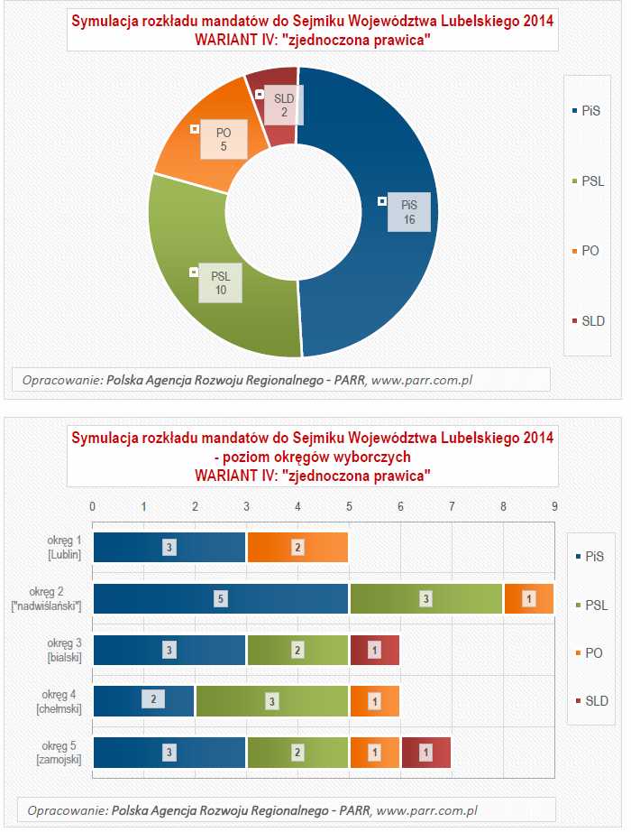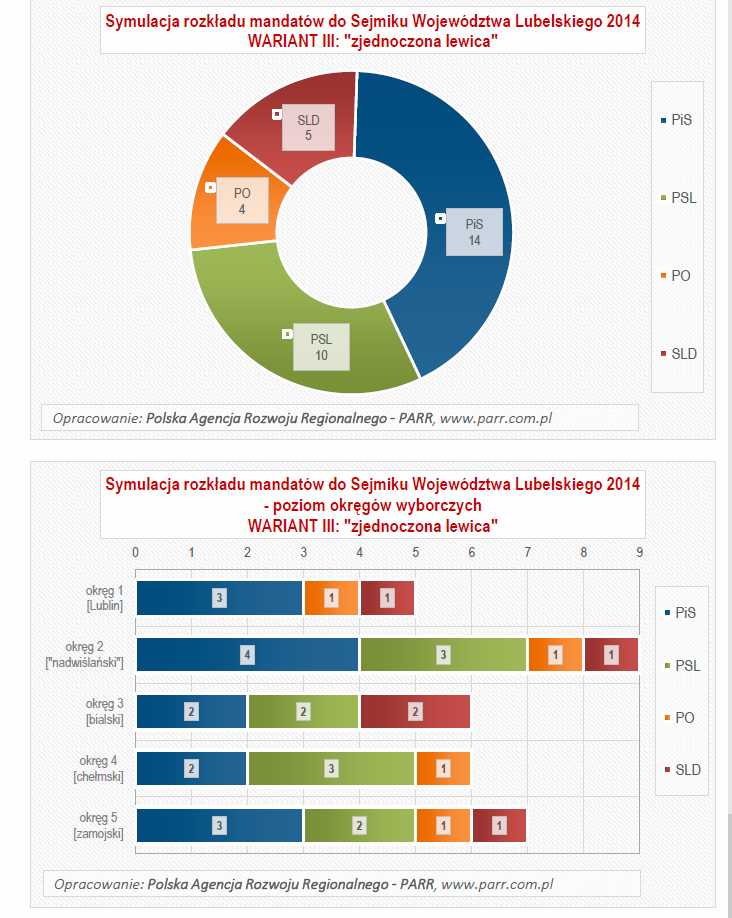 Symulacja przeprowadzona przez PARR (Polską Agencję Rozwoju Regionalnego) pokazuje, że PiS bliski jest zdobycia samodzielnej większości w wyborach do sejmiku województwa lubelskiego. W wariancie, w którym prawica wystawia wspólną listę do sejmiku, Prawo i Sprawiedliwość ma 16 mandatów (przy 33 do zdobycia). Symulacja pokazuje też jaki bonus może zyskać lewica, jeśli jednak wystawi wspólną listę. Oto sześć wariantów wyniku wyborów.