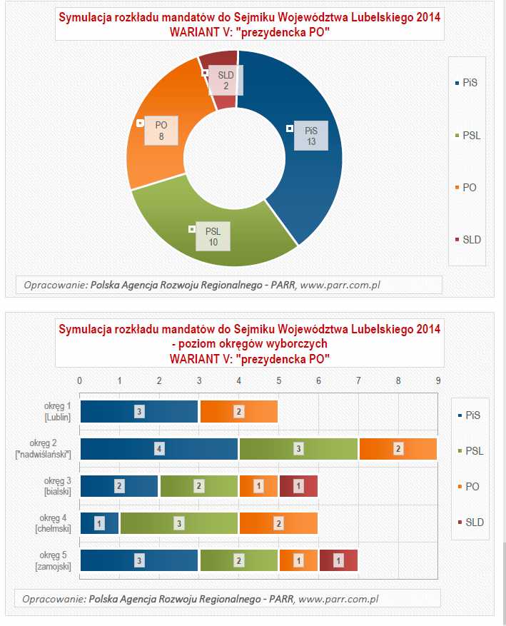 Wariant V - "PO z prezydentami". Ten wariant zakłada, że liderami list PO do sejmiku są: w okręgu 1 Krzysztof Żuk (Prezydent Miasta Lublin), w okręgu 2 Janusz Grobel (Prezydent Miasta Puławy), w okręgu 3 Andrzej Czapski (Prezydent Miasta Biała Podlaska), w okręgu 4 Krzysztof Grabczuk (były Prezydent Miasta Chełm) i w okręgu 5 Marcin Zamoyski (Prezydent Miasta Zamość). Opracowany dodatkowy algorytm sprawdza czy Platforma Obywatelska mogłaby liczyć na wzrost liczby radnych wojewódzkich w wyniku liderowania przez prezydentów listom sejmikowym tej partii.