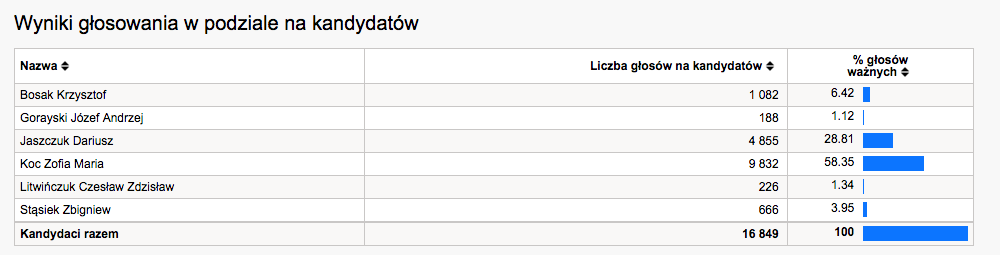 Kandydat PiS Jacek Rusiecki otrzymał wg danych PKW 37%, podczas gdy kandydat PSL 35%. Kandydat PO Zbigniew Pacelt finiszuje ze słabym wynikiem 14%.