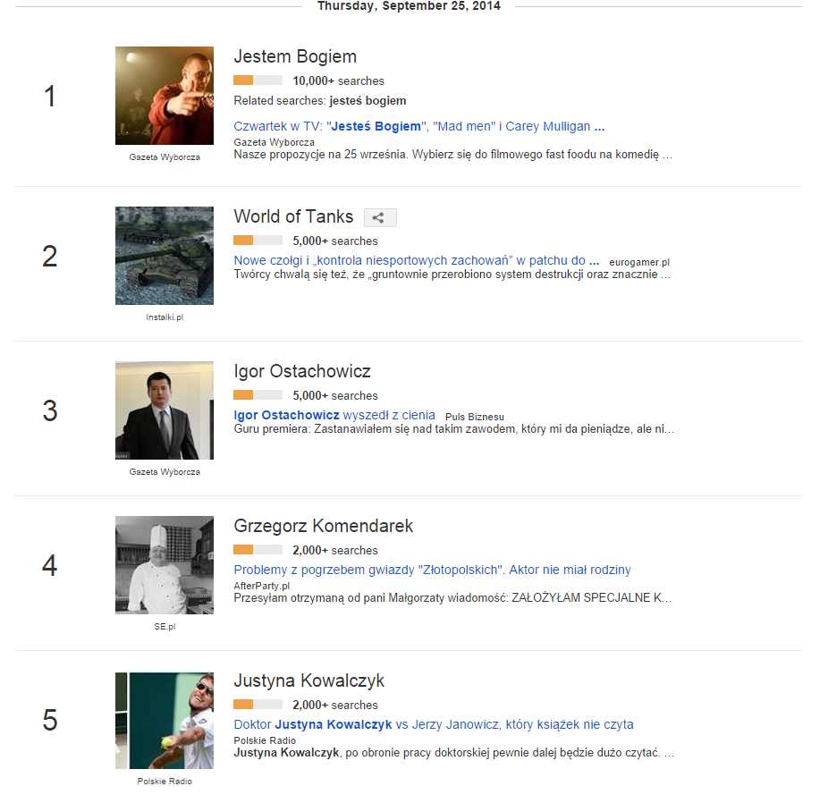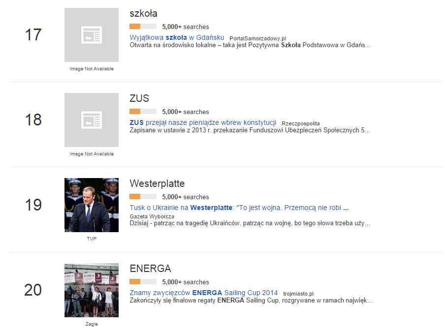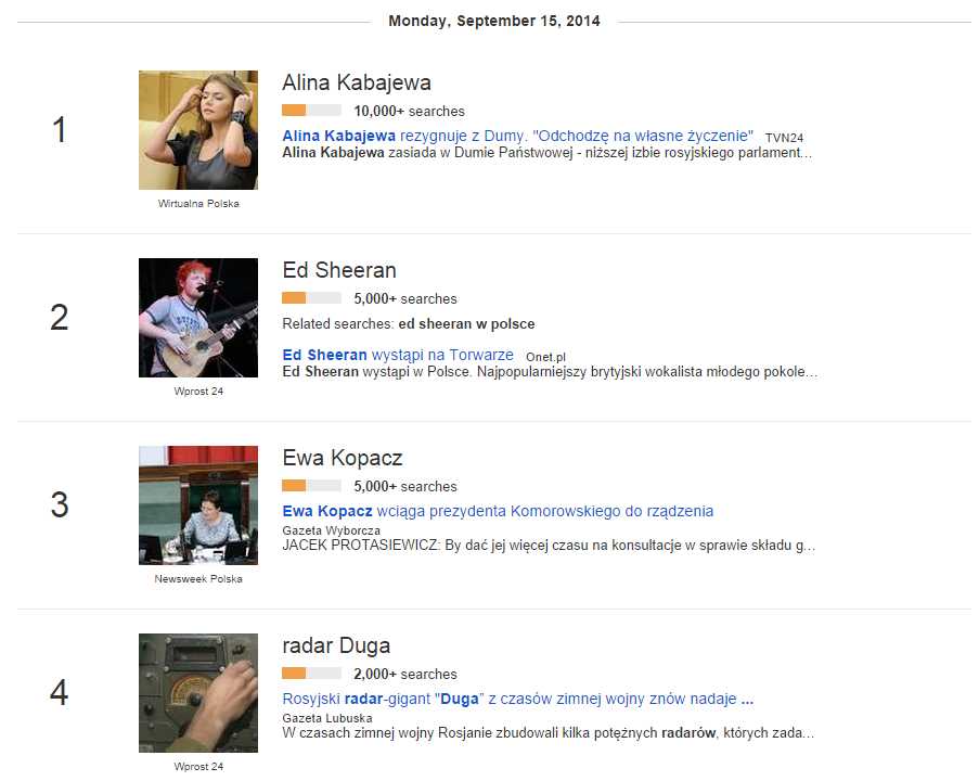 Mimo, że ten temat utrzymuje się w mediach tradycyjnych do wtorku, nie był później widoczny w Google Trends. Warto zauważyc, że wypowiedź premier Kopacz o sprzedaży broni Ukrainie - nie była na tyle popualrna, by znaleźć się w najpopularniejszych wynikach Google Trends we wrześniu. Tak samo jest z przygotowaniami do expose czy konsekwencjami wejścia Grzegorza Schetyny do rządu. Także informacje o spięciach na linii Kopacz-Tusk nie wywołały większego echa.