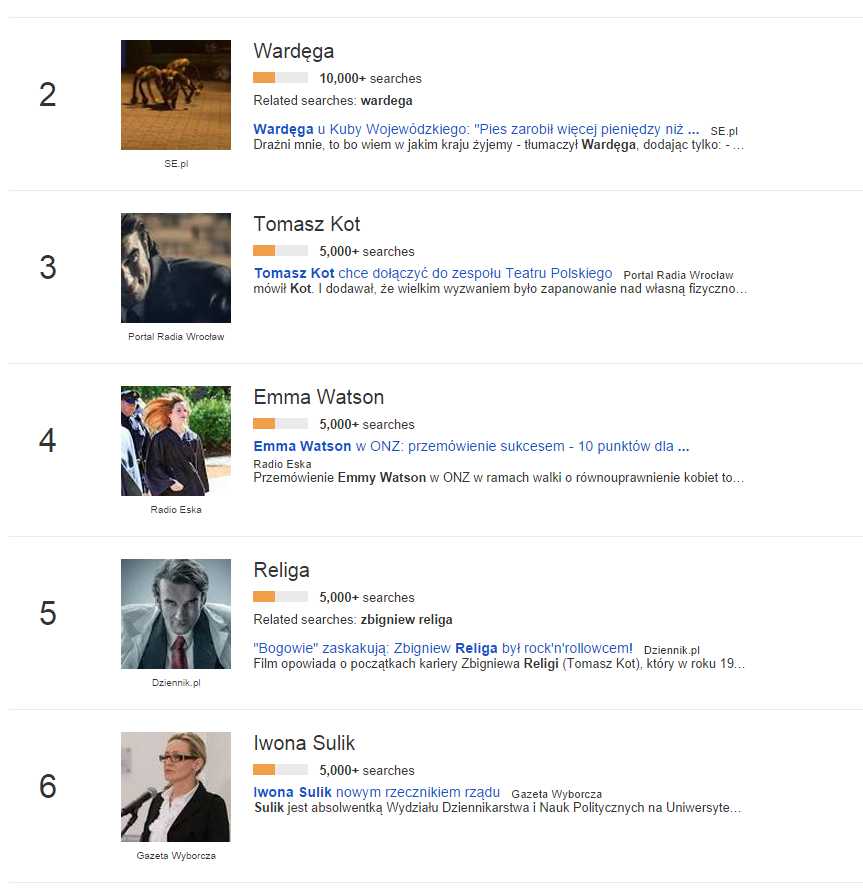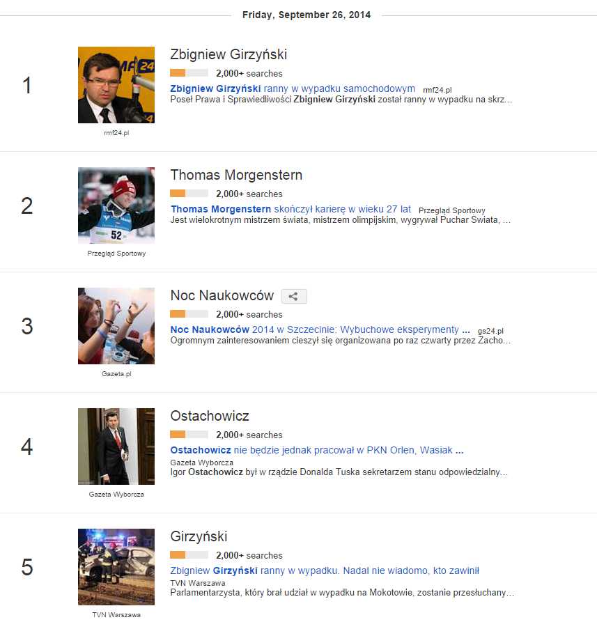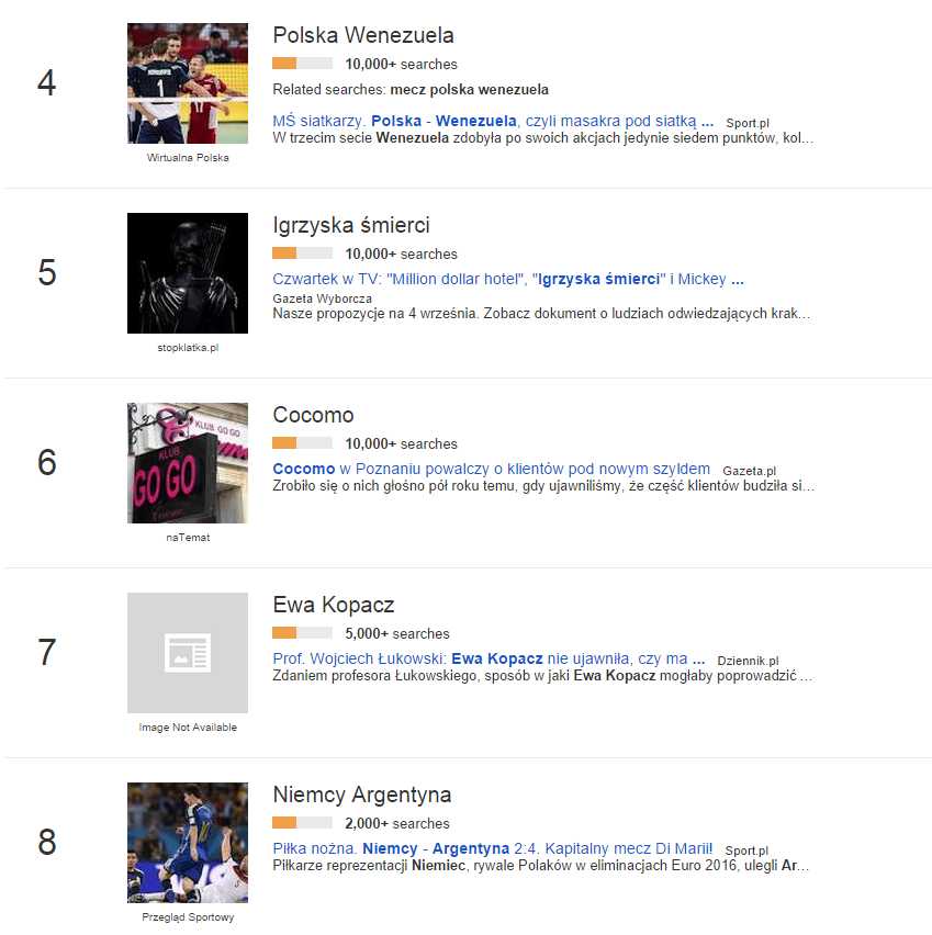 Kończący się miesiąc był jednym z najciekawszych w polskiej polityce od czasu kampanii przed wyborami parlamentarnymi w 2011 roku. Ale spogladając na najpopularniejsze wyniki wyszukiwań w Google Trends, można stwierdzić, że uwaga opinii publiczna koncentrowała się na zupełnie innych tematach, przede wszystkim sportowych (MŚ w siatkówce). Polityka pojawia się sporadycznie, w przeciwieństwie np. do zainteresowania aferą taśmową bezpośrednio po jej wybuchu.